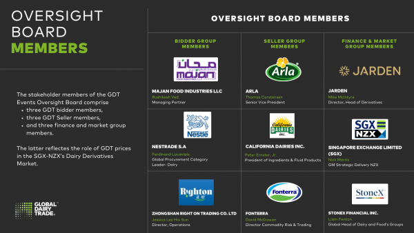 The Board comprises a balanced representation of GDT participants including bidders, sellers and financial market members. Oversight Board members meet several times per year to monitor GDT’s compliance with appropriate governance practices and to vote on any proposed changes to the GDT Trading Event Rules.
