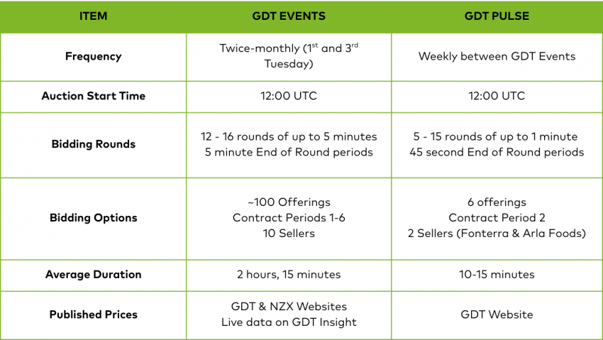 GDT Events continues to be the large volume, high liquidity events that the dairy industry watches, while GDT Pulse intends to provide interim price discovery for core commodity products between the GDT Events auctions.